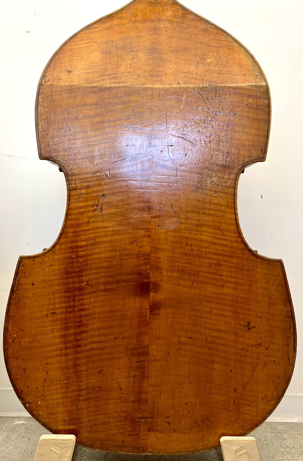 A gorgeous 5 string German flatback bass of ample size and playable string length. The honey-amber varnish and excellent flamed maple back and sides make it an eye catcher.