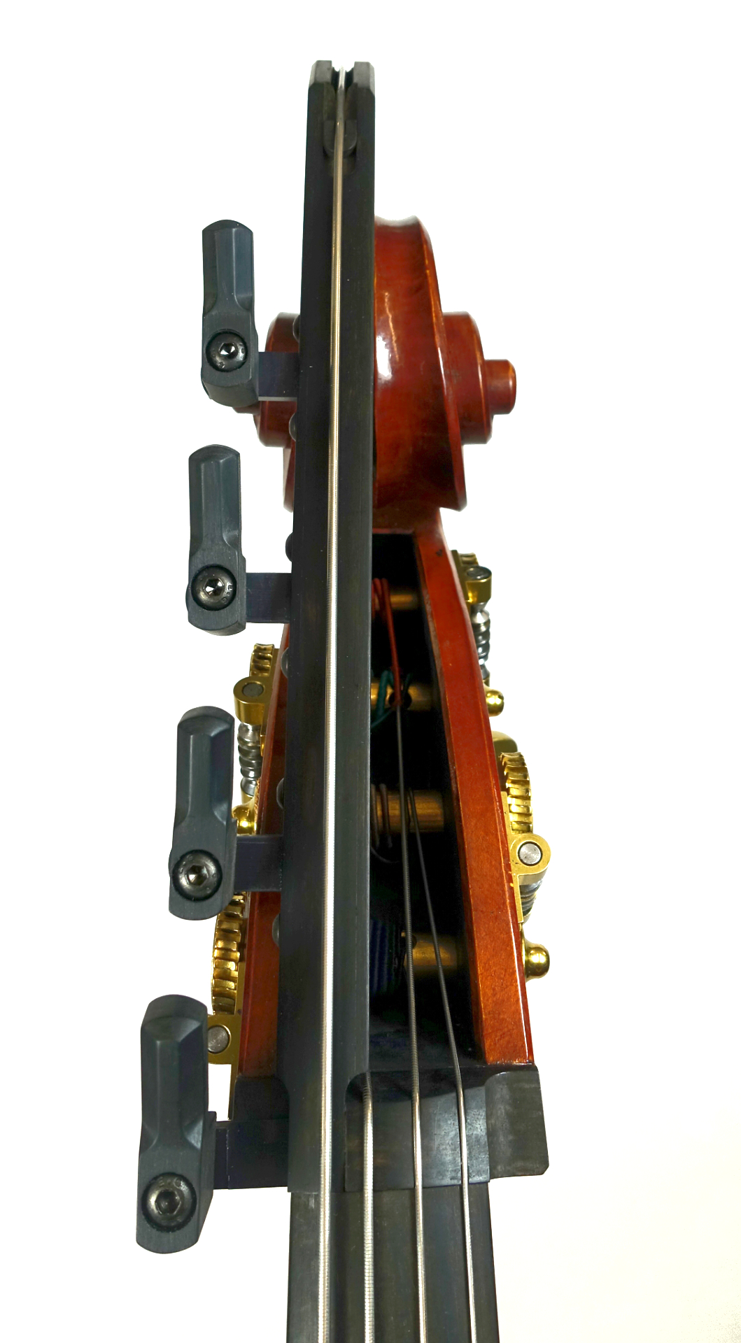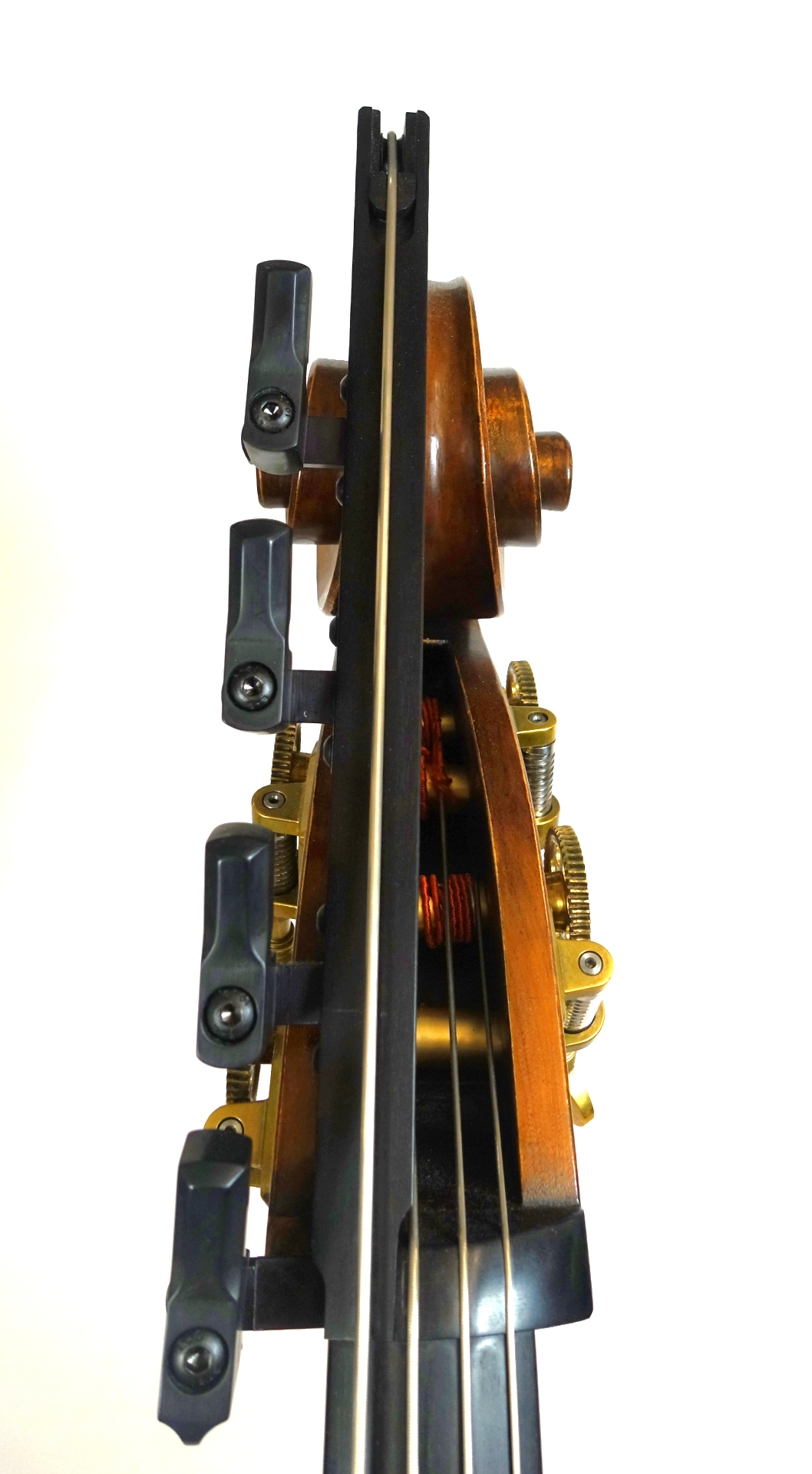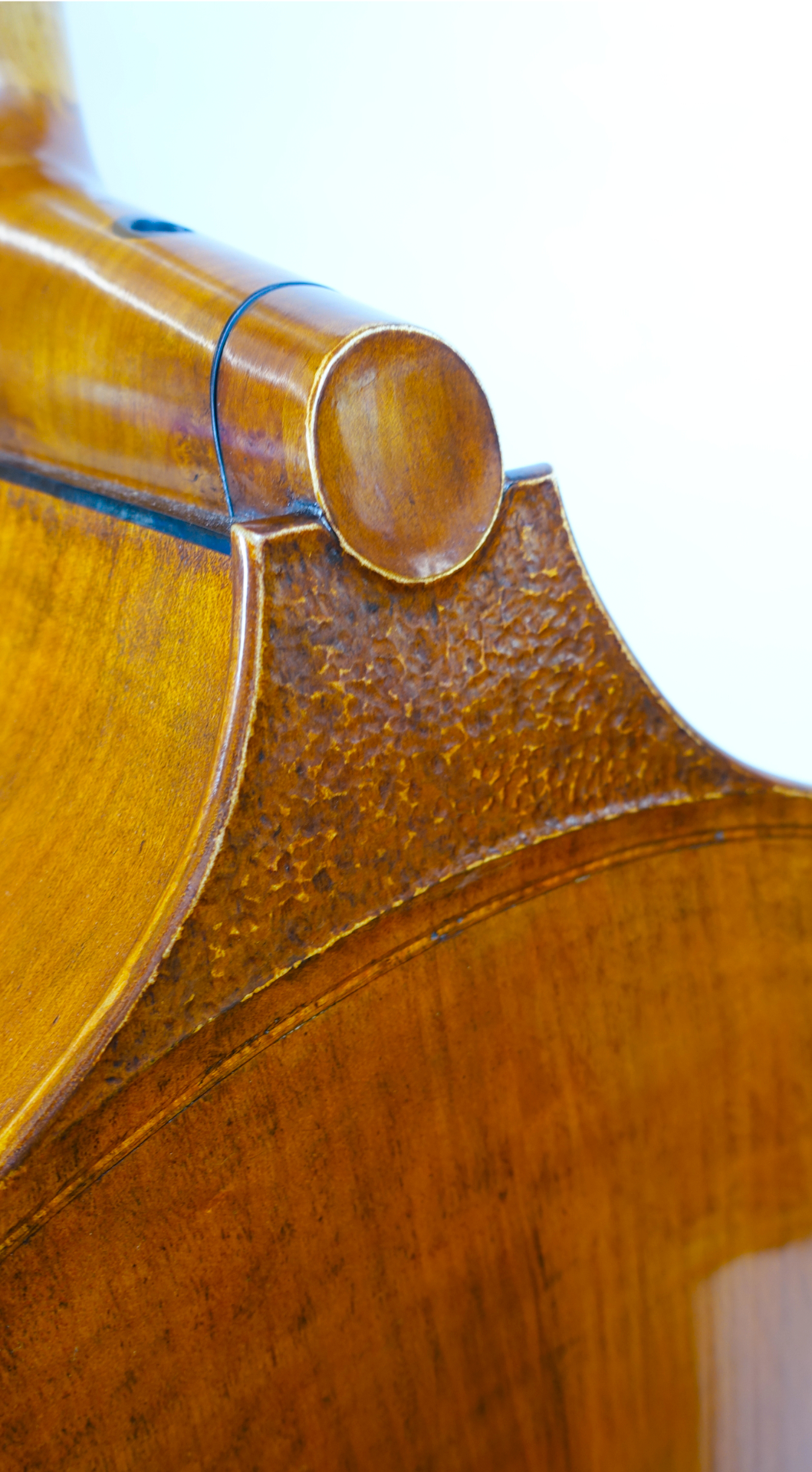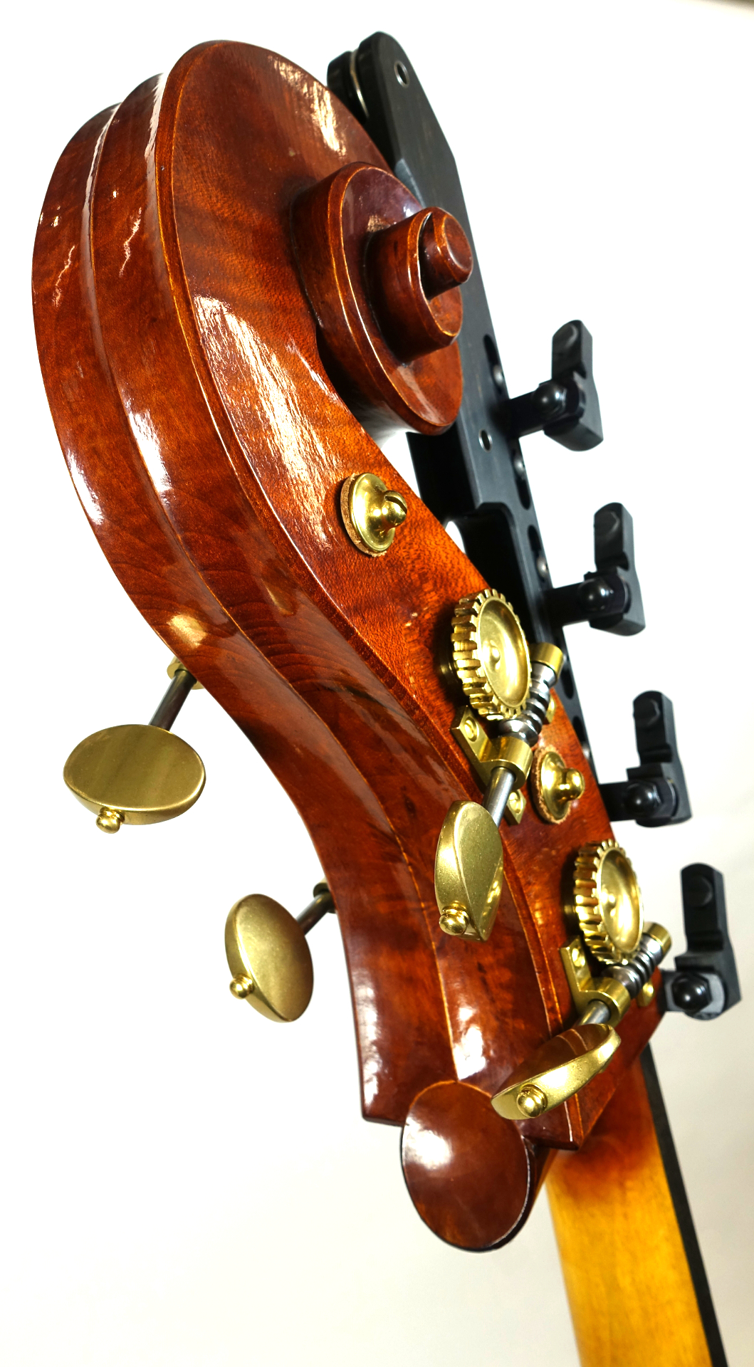 I designed this model as a 3/4 size instrument with a large low end, shorter string length, and exceptional access to the upper registers. The varnish is a transparent rosinate oil varnish by Dr. J.G. McIntosh of Seattle Washington.